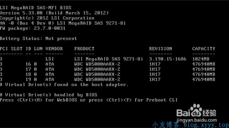 3、Raid卡首页叫作WebBIOS,如下图。左侧是功能菜单,右侧可以看到所有物理磁盘,本例安装了4块500G硬盘,后面所有的配置都可以在这里完成