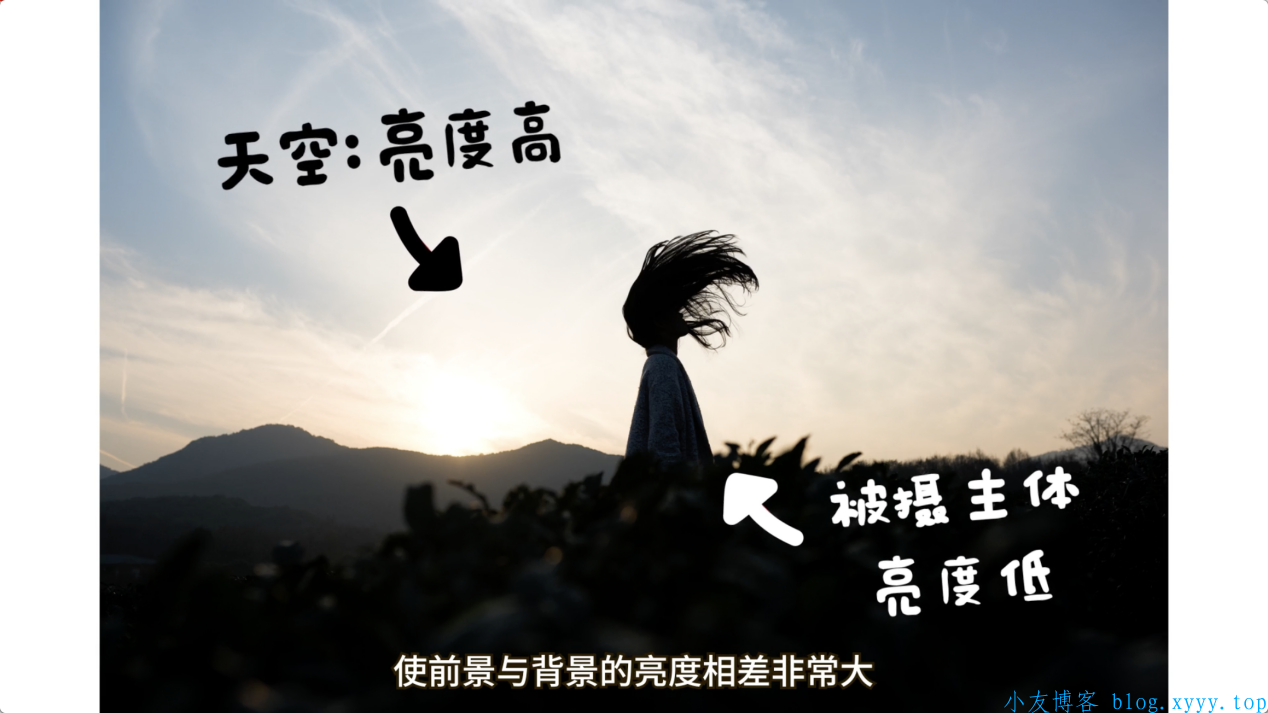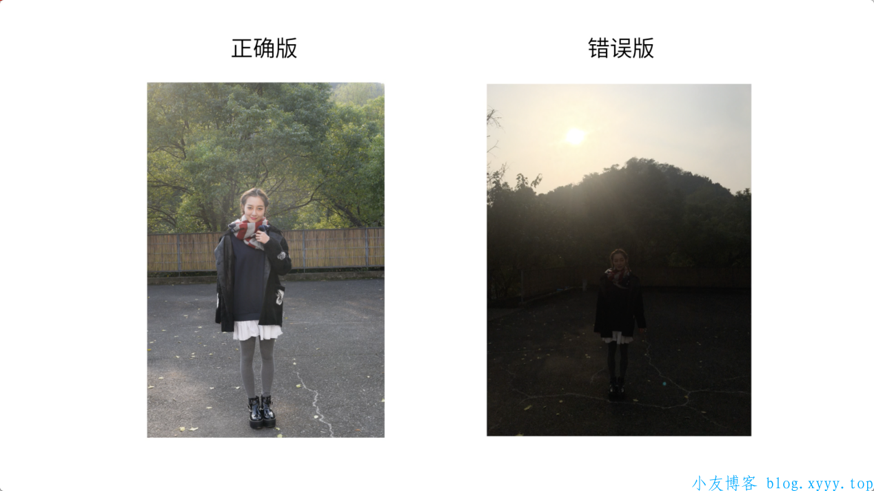 观察这两张图片,右边错误版的图片中,太阳和人物的亮度差别非常大。中午的天空亮度极高,而地面和人物相对于天空的亮度,就会显得非常暗,画面光比极大。左图中,我们通过借助树木将天空遮挡住,因为树木和人物的亮度差别远没有人和太阳的差别大,所以画面光比也不会很大,人物和背景树木的亮度都会比较正常。