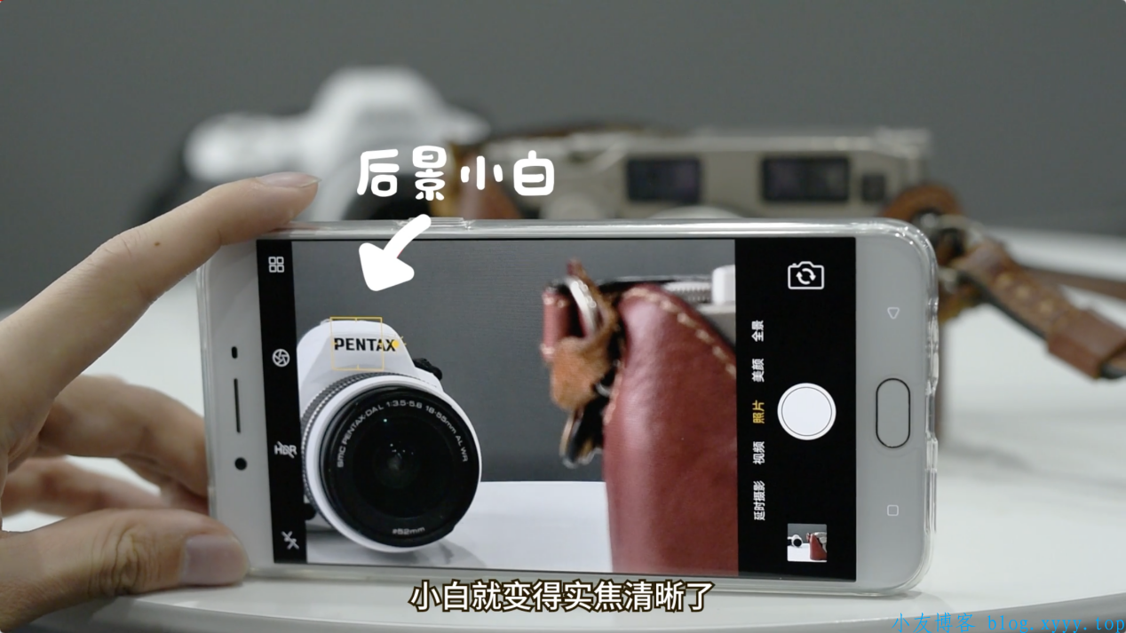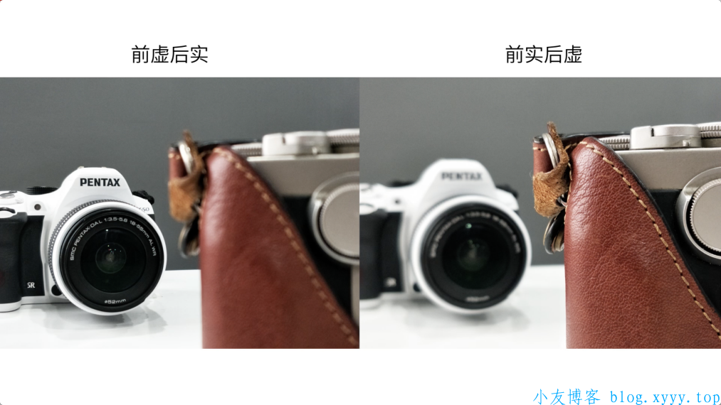 用手机拍照时,点击哪里对焦哪里,实焦是指准确对焦的成像,画面上表现为被摄物体清晰实在。点击前面的小红,小红实焦,皮革的质感清晰可见,而小白就虚焦了,看起来就是模糊的。