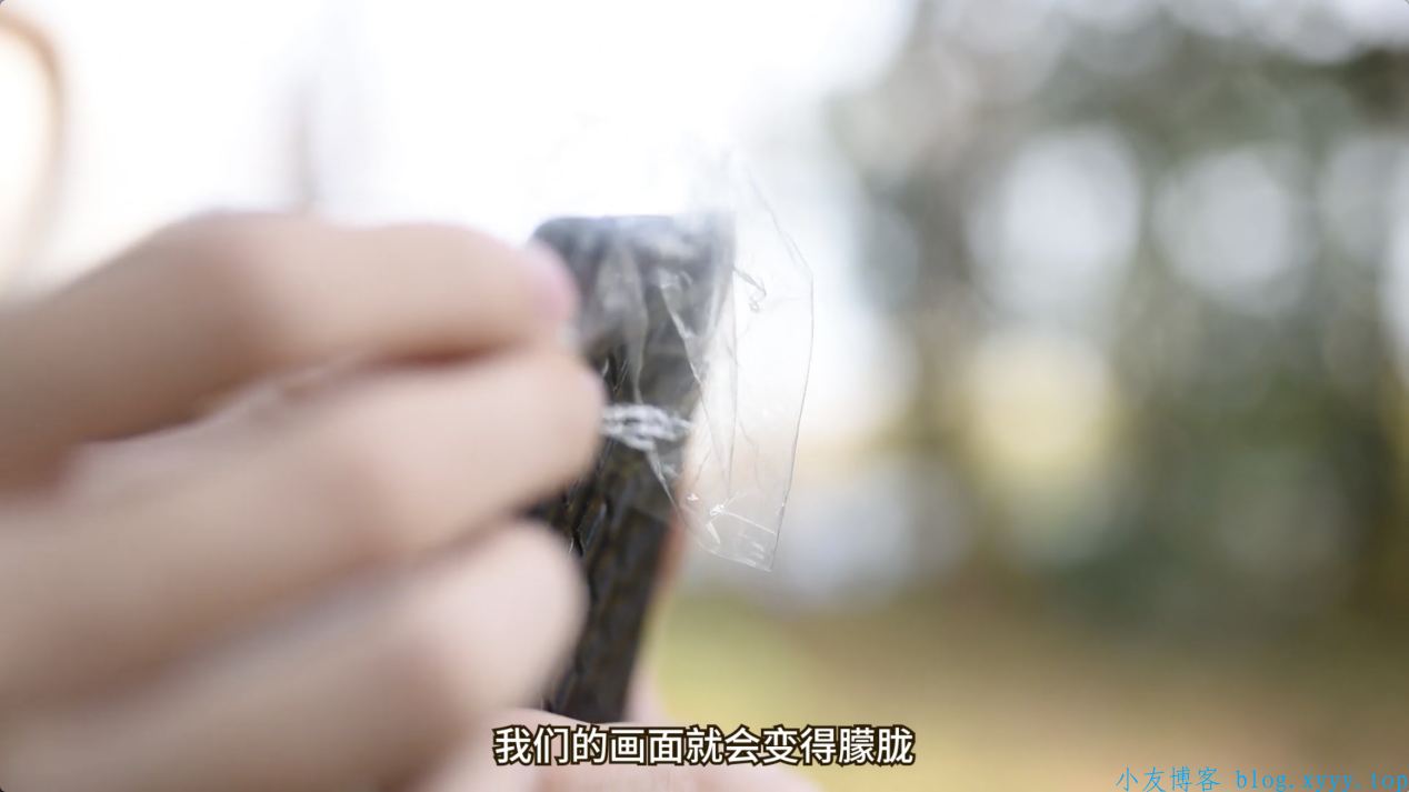 只需要找到塑料纸,比如烟盒的,把他套在手机摄像头上即可。我们的画面就会变得朦胧,不光录像,拍照也可以使用哦!