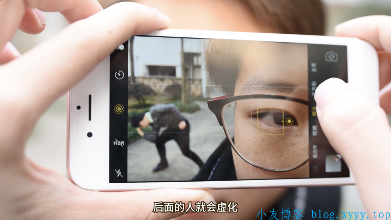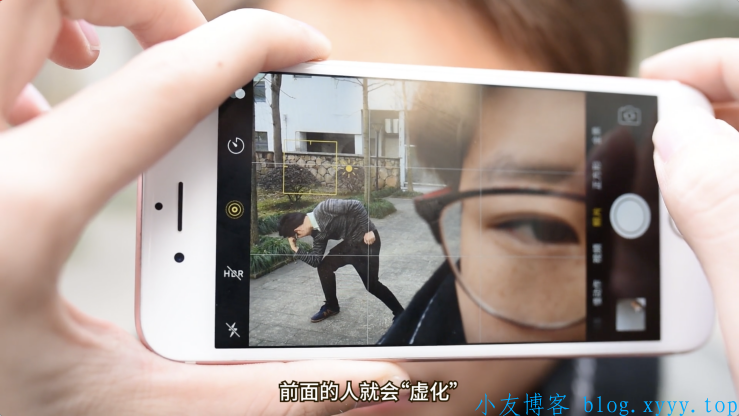 当我们点击到后面的人时,手机就会对焦他,前面的人就会“虚化”。