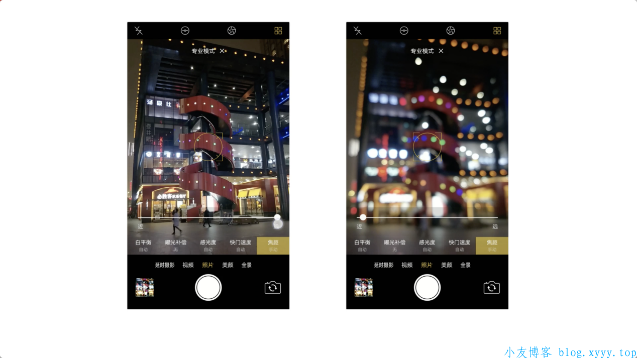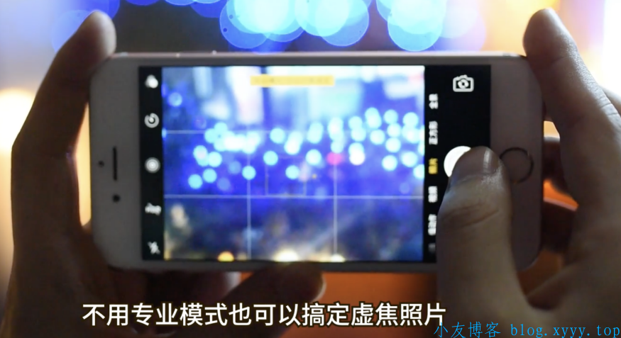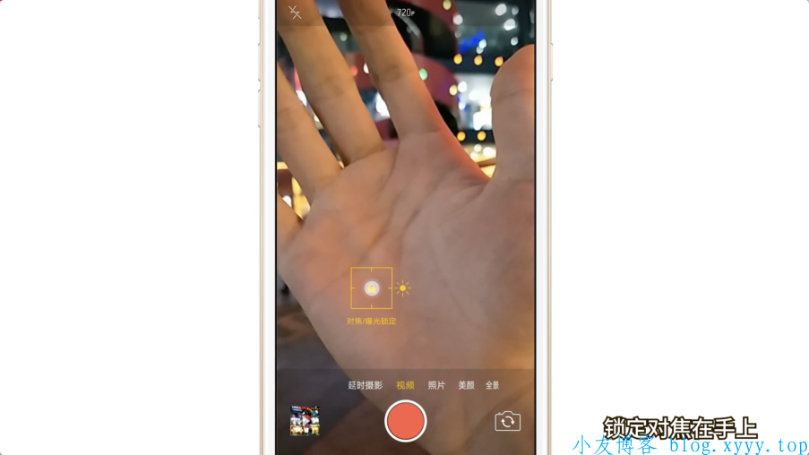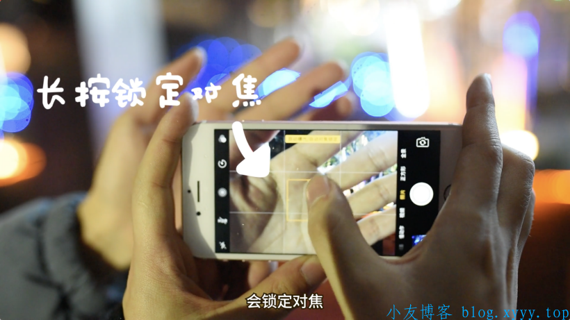 整个过程的关键点在于长按屏幕,锁定对焦在手上,当我们移开手时,画面对焦点其实还是锁定在近处,因此远处的灯光就虚化了。