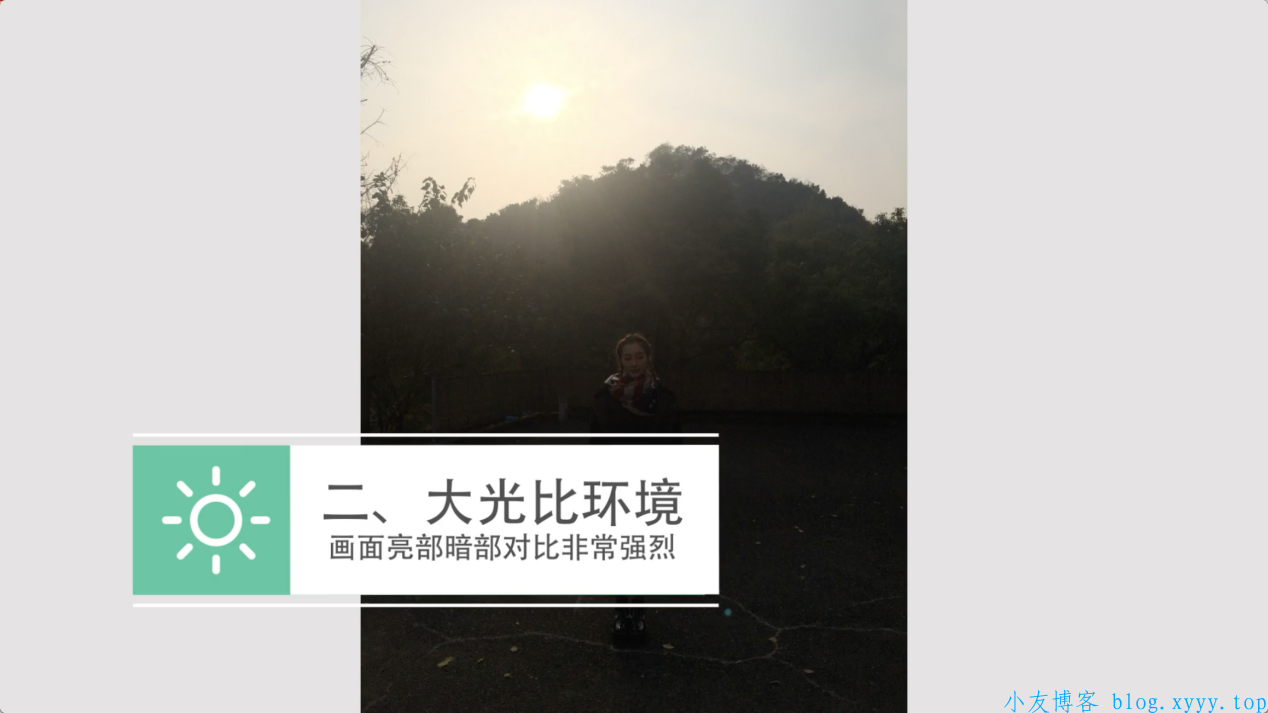 虽然手机可以调光,但是我们拍照时也要尽量避免在大光比的场景下拍摄,我们看这张图,就是一个典型的大光比环境,太阳的光线太强了,而人物的光亮太弱了。