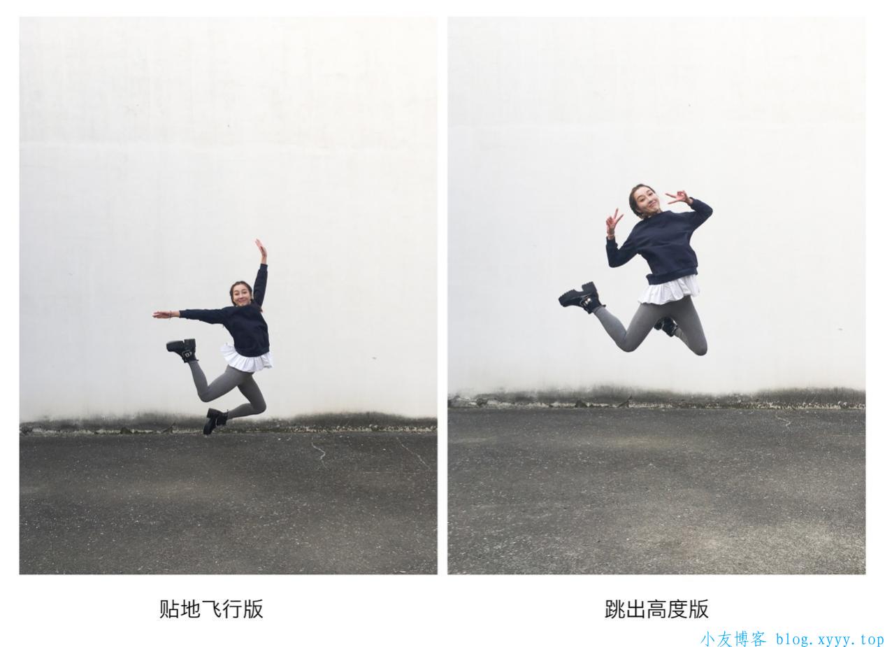 左图,姿势和动作都很优美,结果照片像贴地飞行一样,主要就是因为拍摄角度不够低,而右图则是蹲在地上,从低视角向上拍摄,分分钟就上天了!