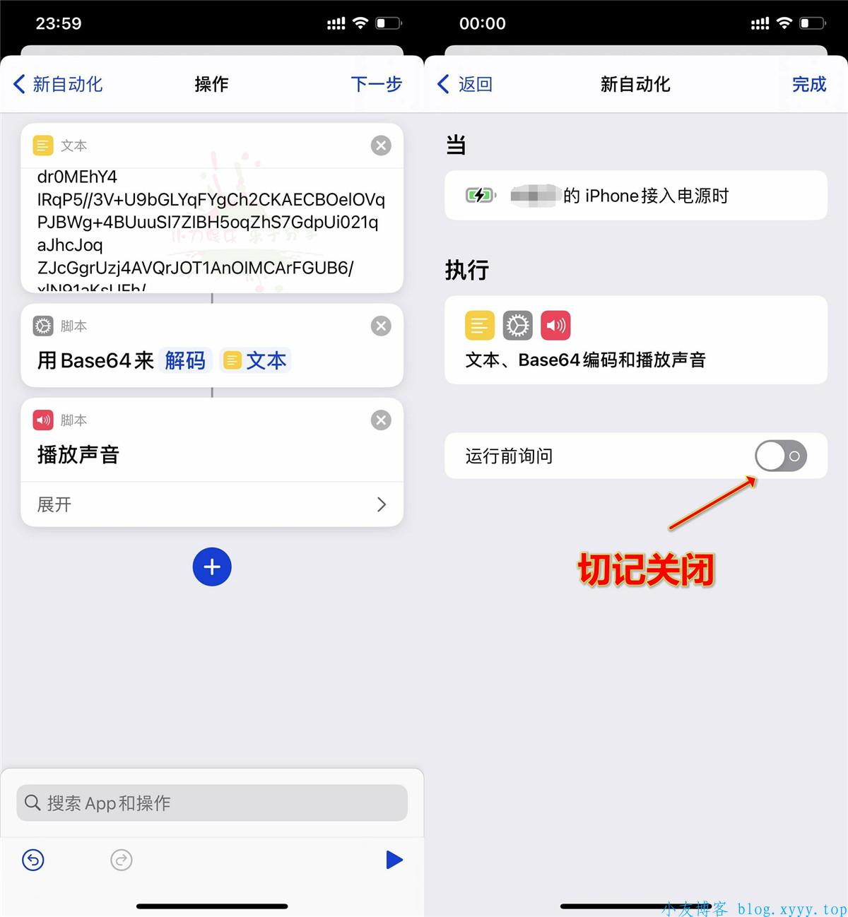 继续点击+号输入“base64编码”把编码改成解码,继续点击+号输入“播放声音”选择后点击下一步,把运行询问关闭点击完成,然后就大功告成啦~!