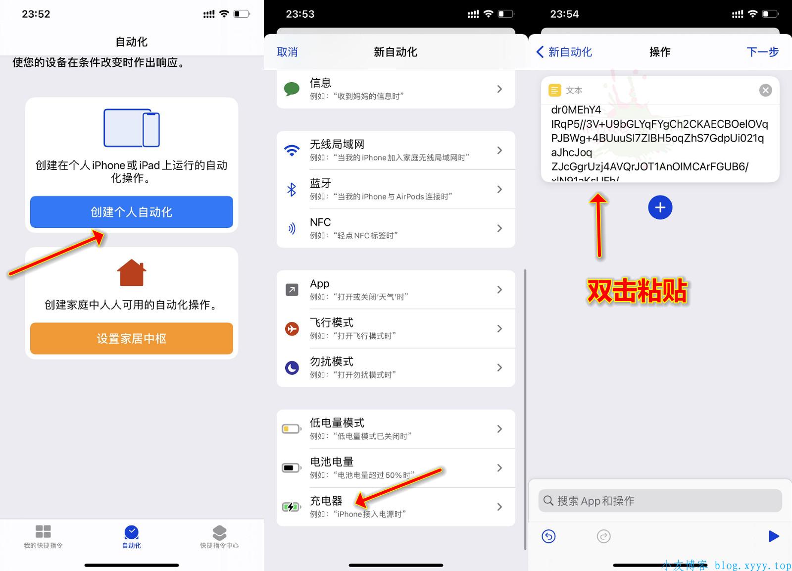 然后点击底部导航“自动化”点击“创建个人自动化”滑到最底部选择“充电器”下一步输入“文本”选择文本然后双击粘贴刚刚拷贝的