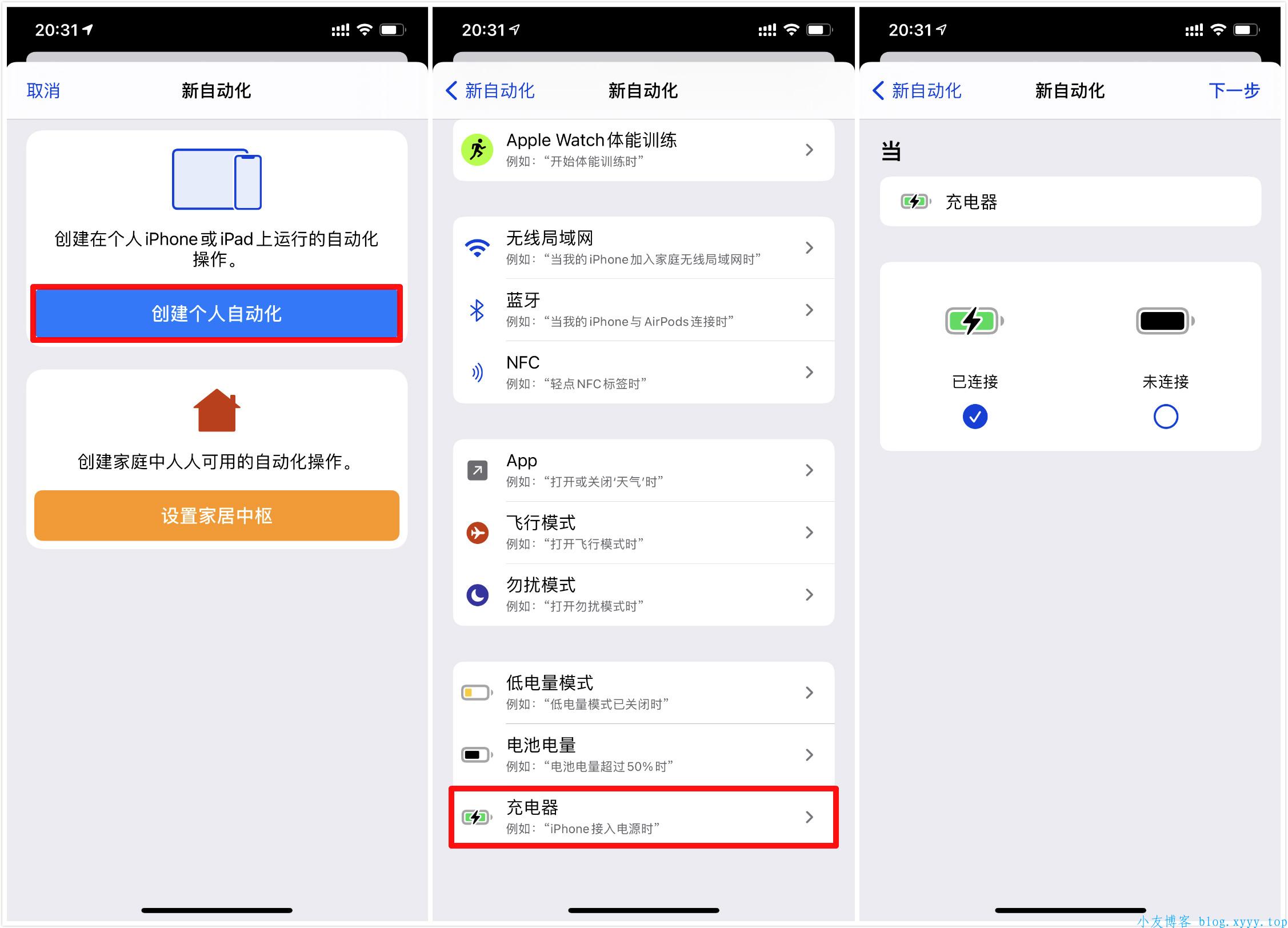 打开快捷指令,点击右上角的+号,创建个人自动化,拉到最下面选择“充电器”,选择“已连接”点击下一步