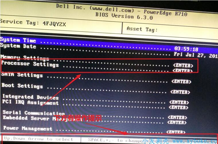 2、按下F2之后,会来到以下界面,选择Processor Settings(处理器设置),按Enter键进入(小提示,如果不知道怎么去操作,可以看到屏幕最下方有提示)