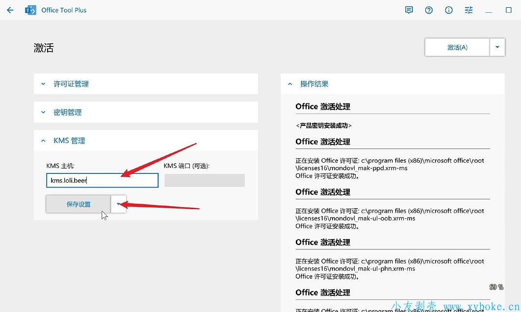 许可证安装完成后,切换到「KMS管理」栏目。在「KMS主机」里填上KMS服务器,这里我填的是kms.loli.beer,你也可以用这个,如果无法使用的,新的KMS服务器请到这里查找。填完KMS主机后,点击「保存设置」按钮
