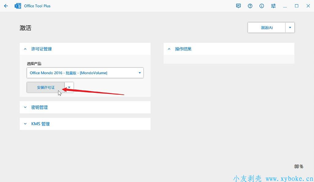 在许可证管理里,选择「Office Mondo 2016 - 批量版」,点击安装许可证(别问为什么,这是唯一可以免费使用Office 365的途径)