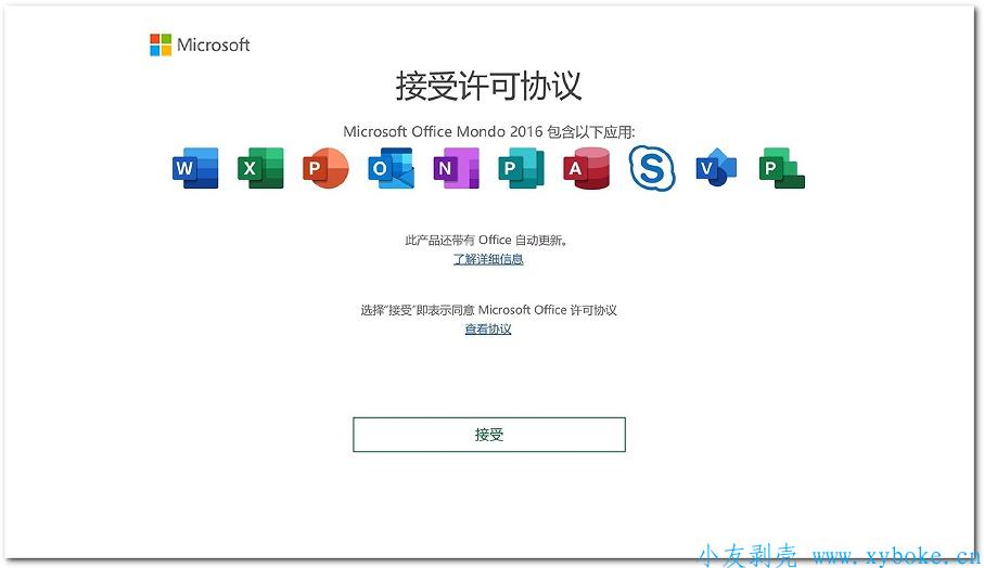 1、打开Office任意组件,会弹出许可协议提示框,选择接受