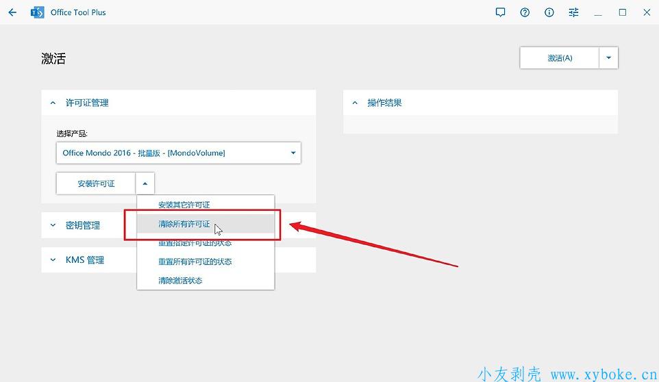 来到激活界面,在许可证管理里,点击安装许可证右侧的下拉三角△符号,点击「清除所有许可证」