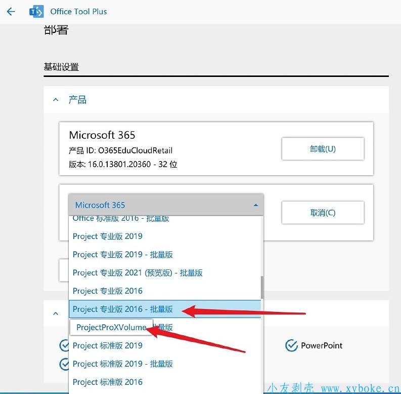 1、如果你想同时安装Project和Visio,那么可以在安装添加上相应的产品,但是需要注意,一定要添加正确的版本,否则会安装失败,正确的版本是: