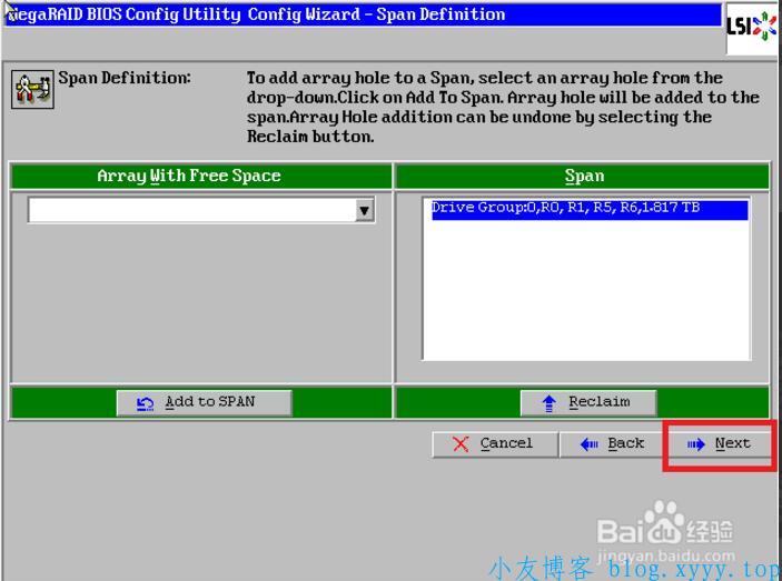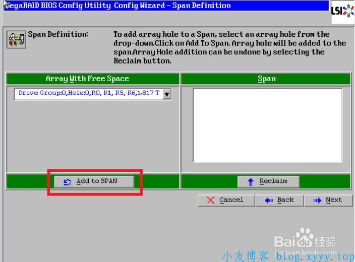 10、点击【Add to SPAN】,将刚才创建好的磁盘组加入到右侧方框内