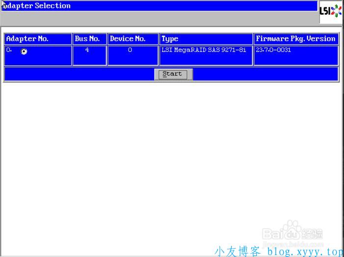 2、按下Ctrl -H组合键后,自检完成就会进入Raid卡配置界面,如下图。在这里可以看到Raid卡的型号和Firmware固件版本,点击【Start】按钮进入Raid卡主页
