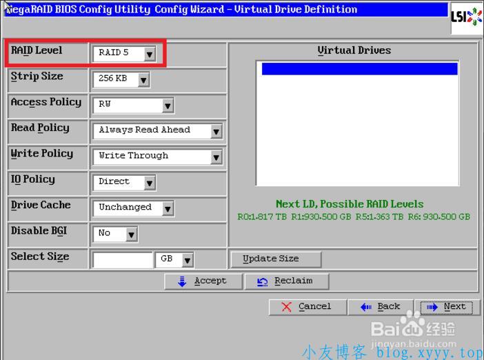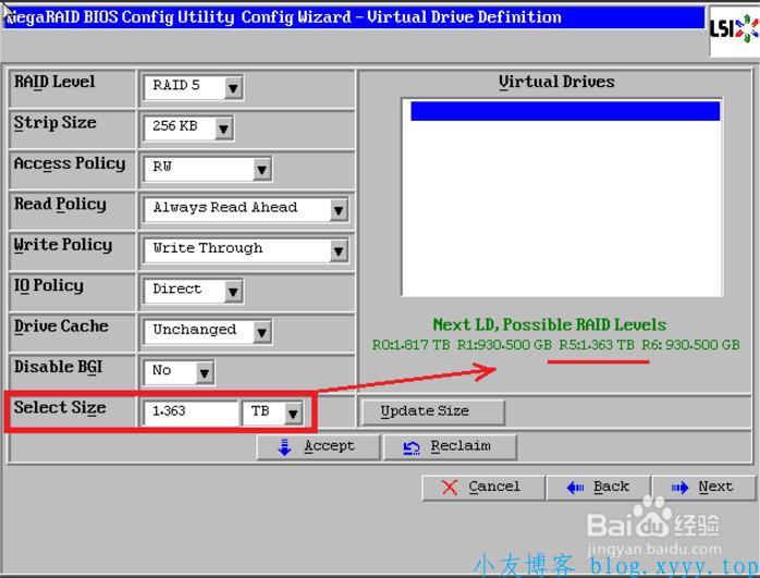13、最后一个参数“Select Size”输入阵列容量大小,最大值可参考右侧绿字提示(其中R5代表做Raid5的最大容量),完成后点击【Accept】