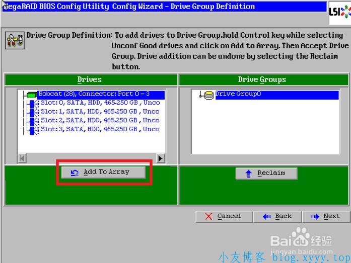 7、左侧方框内可以看到所有未使用的硬盘。我们选择全部(也可以逐个选择),然后点击下方的【Add to Array】将其加入到右侧方框内