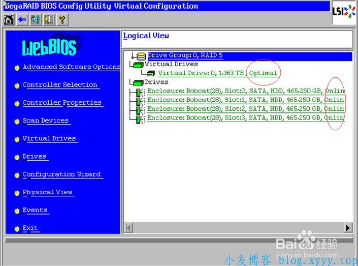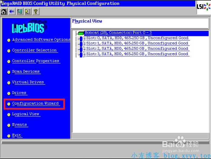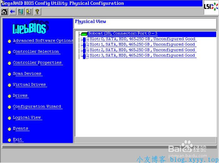 3、Raid卡首页叫作WebBIOS,如下图。左侧是功能菜单,右侧可以看到所有物理磁盘,本例安装了4块500G硬盘,后面所有的配置都可以在这里完成