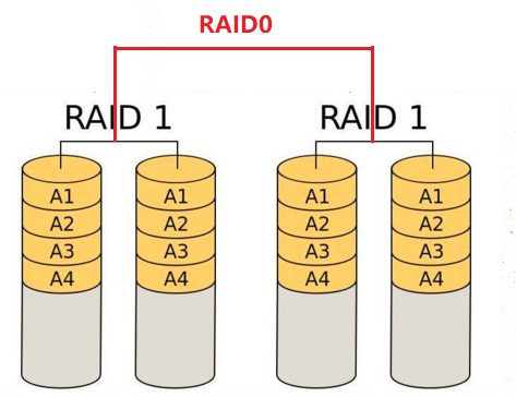 10:mirror+stripe模式,至少需要4快硬盘,先将两块硬盘组成Raid1,然后将两组 Raid1组合成Raid0,存储一分数据时,每一Raid1的组合存储的数据都是均分的,然后 Raid1组合再用mirror模式存储