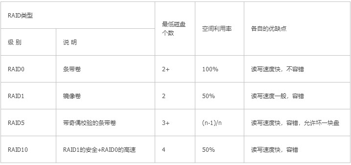 RAID的创建有两种方式:软RAID(通过操作系统软件来实现)和硬RAID(使用硬件阵列卡);了解raid1、raid5和raid10。不过随着云的高速发展,供应商一般可以把硬件问题解决掉。